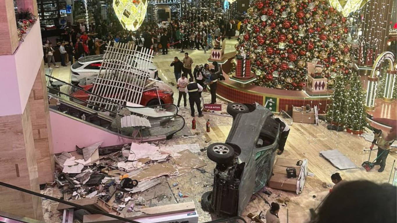 El incidente ocurrió cuando el conductor de la camioneta perdió el control del vehículo. La camioneta se desplomó desde un nivel superior del estacionamiento hasta la entrada principal del centro comercial. El impacto causó el colapso parcial del techo en el área principal.