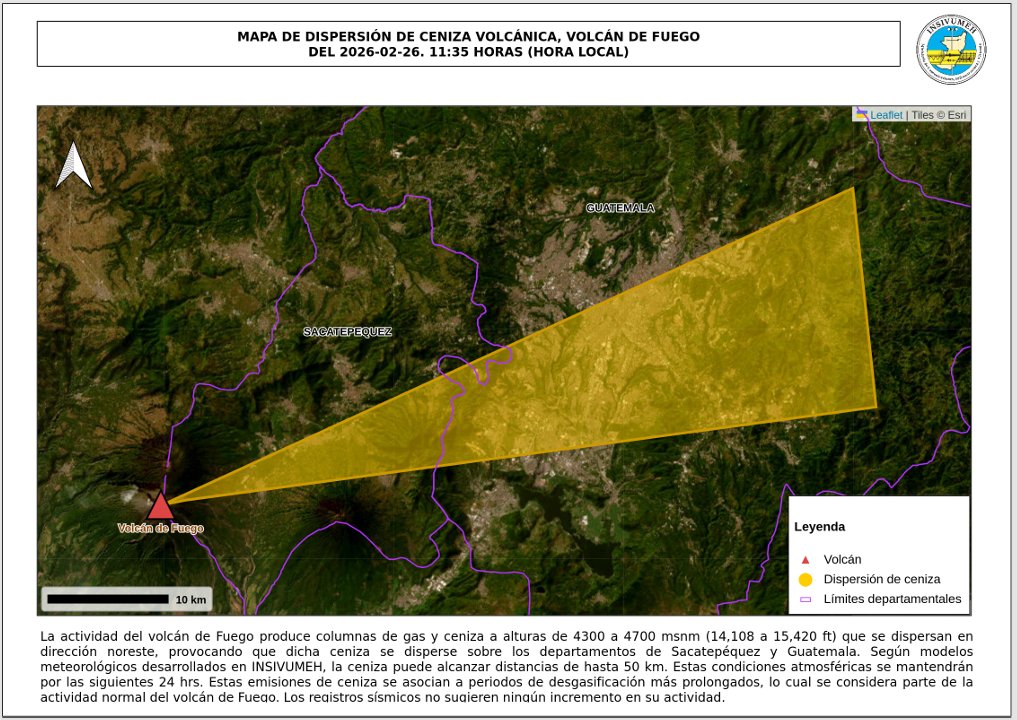 Este 26 de febrero de 2026, autoridades nacionales informaron que se activó una alerta por actividad en el volcán de Fuego. El Ministerio de Agricultura, Ganadería y Alimentación expuso que se mantiene en una fase preventiva por cualquier situación capaz de afectar al sector agropecuario. Tan solo durante las últimas horas, se documentó la caída constante de ceniza, por lo cual, productores temen afectaciones en cultivos, agua y ganado.
